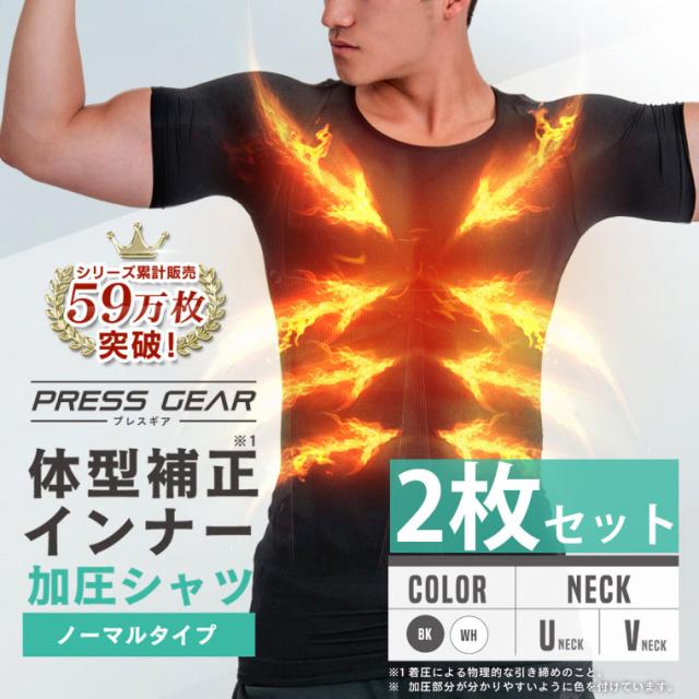 【2枚セット】加圧シャツ メンズ 半袖 元祖 加圧インナー プレスギア 吸汗 速乾 Vネック Uネック 猫背 姿勢 矯正 腹筋 スポーツ トレーニング ダイエット 男性用 補正下着 着圧 Tシャツ 夏 薄手 コンプレッションシャツ 機能性インナー 定番ノーマルタイプ 黒 白 agesugi_sfa