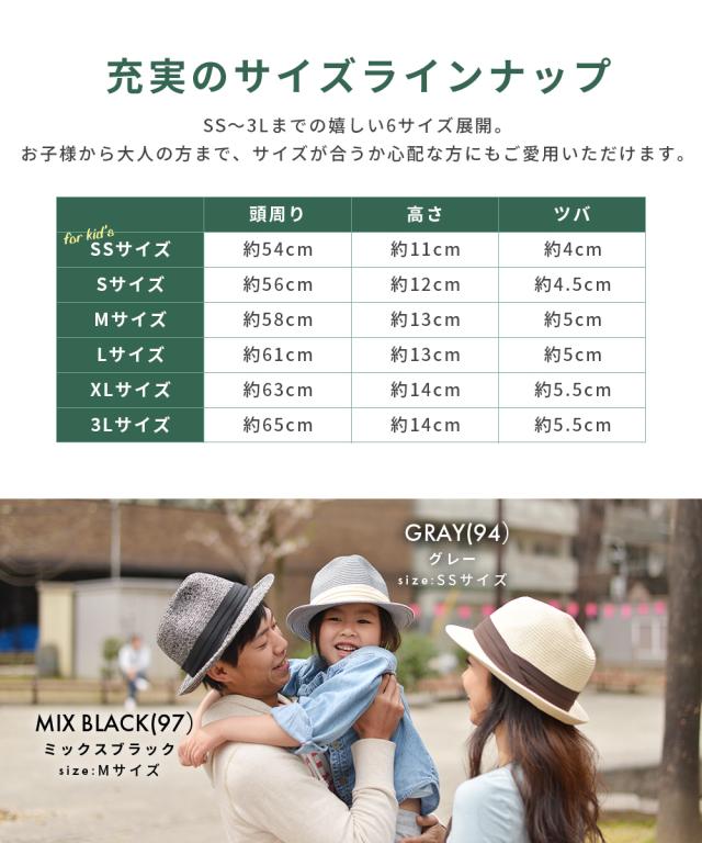| サイズ | SSサイズ / 頭周り約54cm 高さ約11cm ツバ約4cm Sサイズ / 頭周り約56cm 高さ約12cm ツバ約4.5cm Mサイズ / 頭周り約58cm 高さ約13cm ツバ約5cm Lサイズ / 頭周り約61cm 高さ約13cm ツバ約5cm XLサイズ / 頭周り約63cm 高さ約14cm ツバ約5.5cm 3Lサイズ / 頭周り約65cm 高さ約14cm ツバ約5.5cm ※サイズは当店平置き実寸サイズです。 |