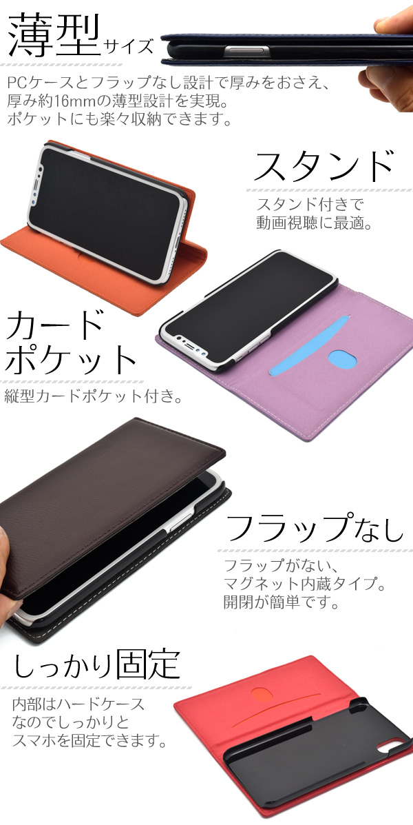 高級感あふれるシープスキンレザーを使用した、シープスキンレザー手帳型ケース。しっとりと吸い付くような手触りの良さと、きめの細かさ、柔らかさが抜群な本物のシープスキンレザーを使用しています。フラップがない、マグネット内蔵タイプなので開閉が簡単です。PCケース採用とフラップなし設計で厚みをおさえ、 厚み約16mmの薄型サイズを実現。※スマートフォンは付属しません。※ライセンス商品ではありません ※カードは付属しません。※ケースをつけたまま撮影できますが、フラッシュ撮影時にケースの色が移り込むことがあります。