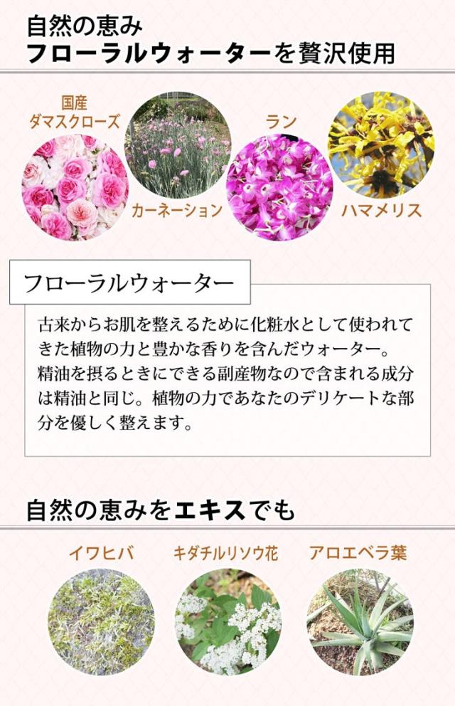 ■成分:水、カーネーション花水、ダマスクバラ花水、ハマメリス花水、コウキセッコク花水、BG、スクワラン、ラウリン酸ポリグリセリル-10、テトライソステアリン酸ソルベス-30、キダチルリソウ花エキス、キンマ葉エキス、サルビアアピアナ葉水、ガリカバラ種子エキス、キクニガナ根オリゴ糖、イワヒバエキス、アロエベラ葉エキス、コメ発酵エキス、ポリソルベート20、カプリル酸グリセリル、褐藻エキス
