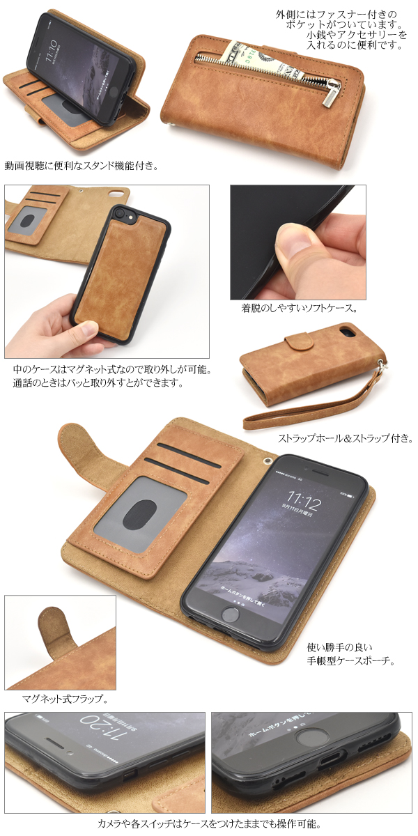 高級感のあるiPhone6/6s/7用ファスナー&ポケットレザーケースポーチ。 内側には5枚のカード収納、外側にはファスナー付ポケットがある便利なポーチです。 中のケースはマグネット式で取り外し可能。通話のときはサッと取り外すことができます。また、カメラ、イヤホンや各種ボタンなどをケースに入れたまま操作可能です。 落下防止に便利なストラップホール&ストラップ付きです。※iPhone6/6s/7は付属しません。※ライセンス商品ではありません。※カメラの操作はケースを装着したままで可能ですが、商品の構造上ケースの色が写り込みます。 予めご了承ください。
