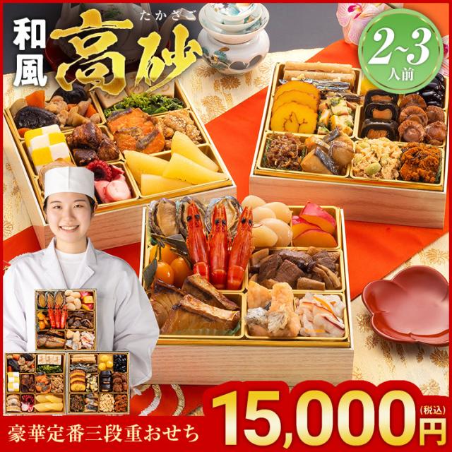 おせち 2026 博多久松 おせち料理 豪華定番三段重『高砂』≪6.5寸×3段重・おせち全32品・2〜3人前≫【送料無料】特典 2人前 3人前