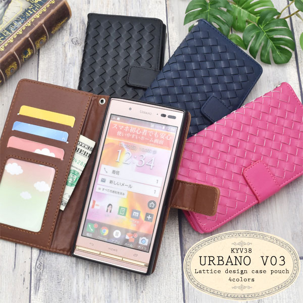 ラティス(格子)デザインのURBANO V03 KYV38用レザーデザインケース。衝撃やキズなどからURBANO V03 KYV38 を守ります。内部ケースはTPUケースで本体の着脱が簡単です。格子状に編み込まれたレザーで、他のケースとは一味違う印象になること間違いなし。4色展開と、カラーバリエーションが豊富なので自分に合うお好きな色をお選びください。背面を折り返すとスタンドとして使用できるので、動画視聴に便利です。落下防止に便利なストラップホール付きです。