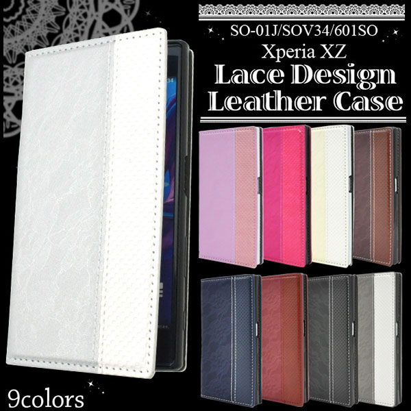 Xperia XZ (SO-01J/SOV34/601SO)用のレザー地の上に薄くレース柄がプリントされた上品なケースです。内側はスウェード調になっており手触りも抜群!便利なカードポケットつきです!衝撃やキズなどからXperia XZs(SO-03J/SOV35/602SO)、Xperia XZ(SO-01J/SOV34/601SO)を守るのはもちろん、カメラ、イヤホンや各種ボタンなどをケースに入れたまま操作することもできます。色はレッド、ブルー、シルバー、ピンク、ホワイト、パープル、ブラウン、ブラック、グレーの9色展開です。