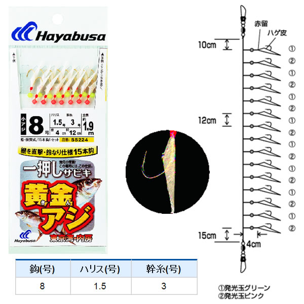 ハヤブサ 一押しサビキ 黄金アジハゲ皮 15本鈎 SS224 (サビキ仕掛け) 8-1.5