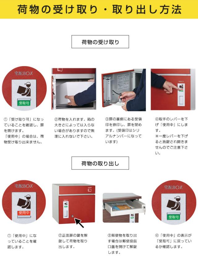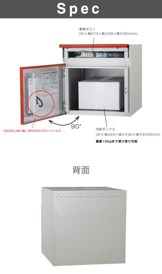 特徴:外扉は数字を回して施錠解錠できるダイヤル錠付きです。内扉はシリンダー錠で施錠を行うタイプです。ダンボールの規格サイズでは、宅配80サイズ(3辺の合計が80cm)まで、重量は18kgまで荷物が受け取れます。
