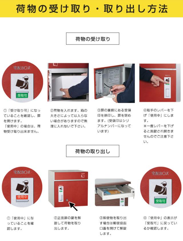 特徴:外扉は数字を回して施錠解錠できるダイヤル錠付きです。内扉はシリンダー錠で施錠を行うタイプです。ダンボールの規格サイズでは、宅配100サイズ(3辺の合計が100cm)まで、重量は20.0kgまで受け取れます。宅配投函口蓋の裏に専用受領印が付いています。