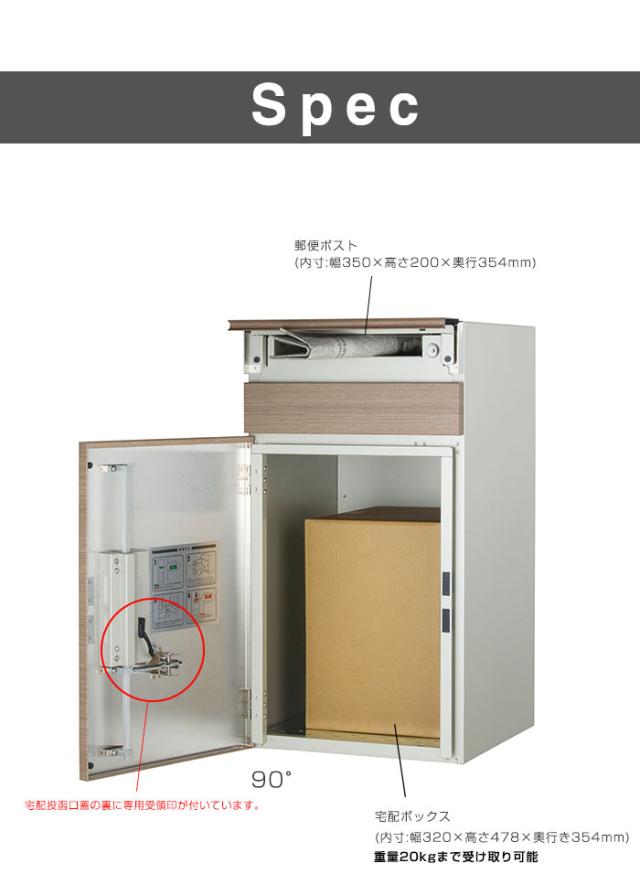 特徴:外扉は数字を回して施錠解錠できるダイヤル錠付きです。内扉はシリンダー錠で施錠を行うタイプです。ダンボールの規格サイズでは、宅配100サイズ(3辺の合計が100cm)まで、重量は20.0kgまで受け取れます。宅配投函口蓋の裏に専用受領印が付いています。