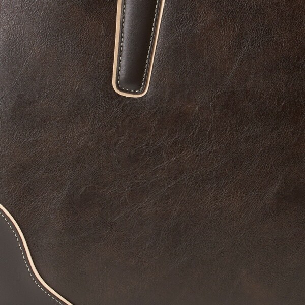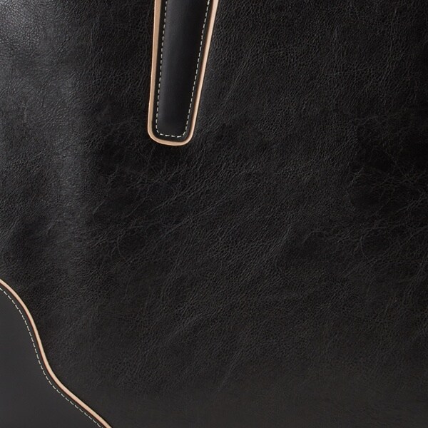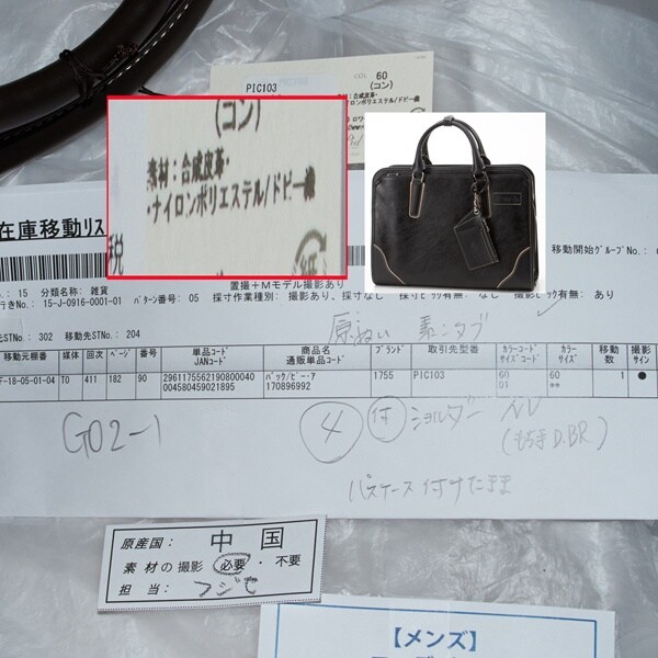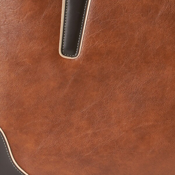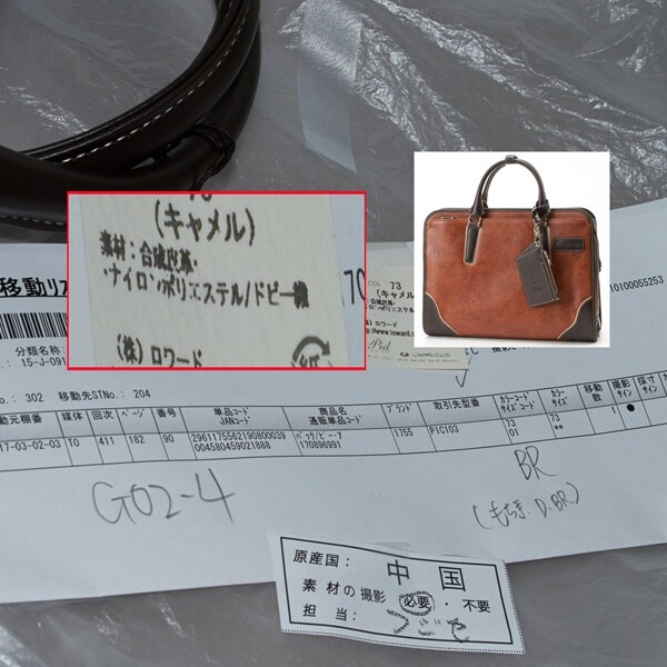 material 本体の素材には、シボ状の型を押したポリウレタン合皮とドビー織ポリエステルナイロン生地を使用した異素材コンビにしております。ポリウレタン合皮は発色に優れ肌触りが良く丈夫です。ドビー織ポリエステルナイロン生地には表面に撥水加工・裏面にPVC(塩化ビニール加工)施してあります。撥水加工に、さらにPVC(塩化ビニール加工)を施すことにより、水対策は勿論のこと生地にありがちな汚れや水濡れによる重みや方崩れ、内容物が濡れる等を防いでいます。また、強さと適度のはりを持たせています。付属に使われている合皮には、強化PVCを使用しております。PVCに更に強度を増すために210Dオックスナイロンを挟み込んでいます。その為、引っ張り強度、引き裂き強度が増します。