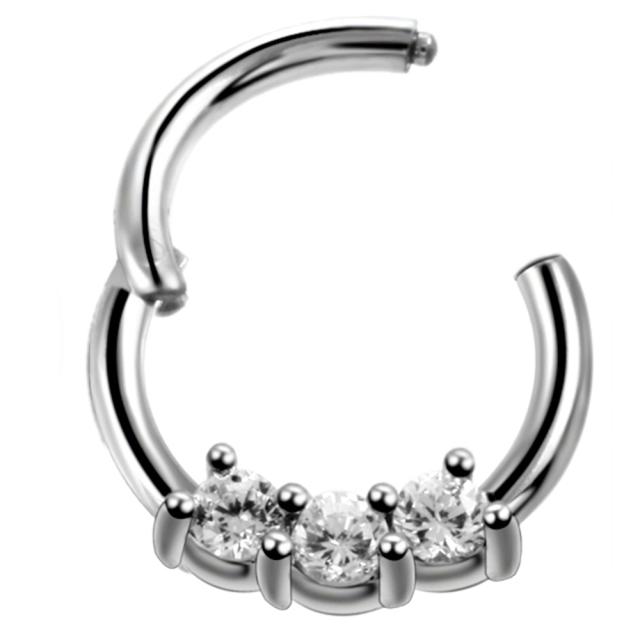 スムーズセグメント型のリング型ボディピアスのトップに、クリスタルのジルコニアをセットしたワンタッチで着脱できるヒンジ付きシームレスボディピアス。シンプルなリングに上品なクリスタル3つを並べた大人のボディーピアス。ワンタッチで装着できるクリップタイプのセグメントなので女の子でも簡単に扱えます。耳たぶやヘリックス、トラガス、セプタム、ニップル乳首など幅広いピアッシングに使えるのポイント。安心のサージカルステンレスもうれしい。【スペック】