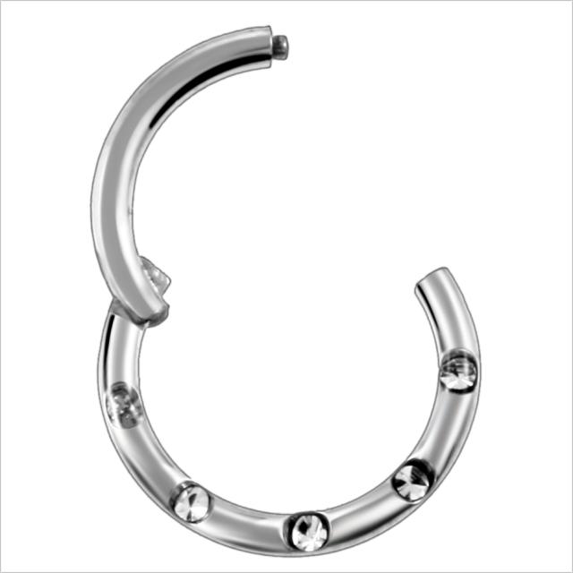 スムーズセグメント型のリング型ボディピアスに、クリスタルのジルコニアをセットしたワンタッチで着脱できるヒンジ付きシームレスボディピアス。シンプルなリングに上品なクリスタルを並べた大人のボディーピアス。ワンタッチで装着できるクリップタイプのセグメントなので女の子でも簡単に扱えます。耳たぶやヘリックス、トラガス、セプタム、ニップル乳首など幅広いピアッシングに使えるのポイント。安心のサージカルステンレスもうれしい。【スペック】