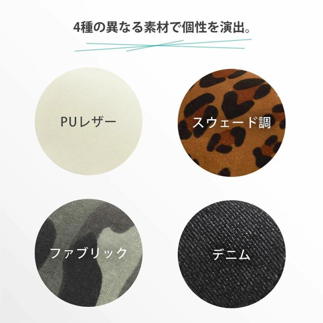 選べる8パターン、ブラックレザー、ホワイトレザー、インディゴデニム、ブラックデニム、ダークブラウンレオパード、ブラウンレオパード、グレーカモ(灰色迷彩)、グリーンカモ(緑色迷彩)。
