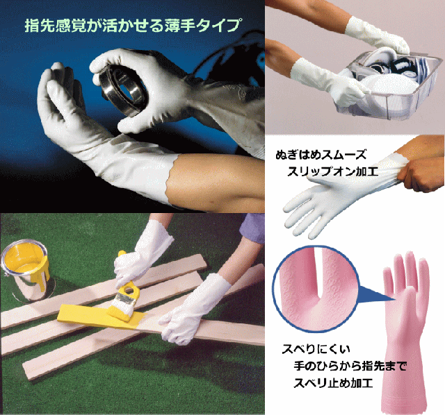 ・手袋内面を特殊被膜でコーティングし、ぬぎはめしやすいスリップオン加工を施しています