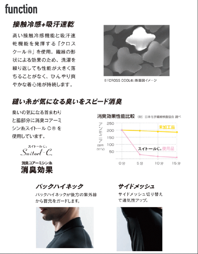 ・高い接触冷感機能と吸汗速乾機能を発揮する「クロスクール」を使用。繊維の形状による効果のため、洗濯を繰り返しても性能が大きく落ちることがなく、ひんやり爽やかな着心地が持続します