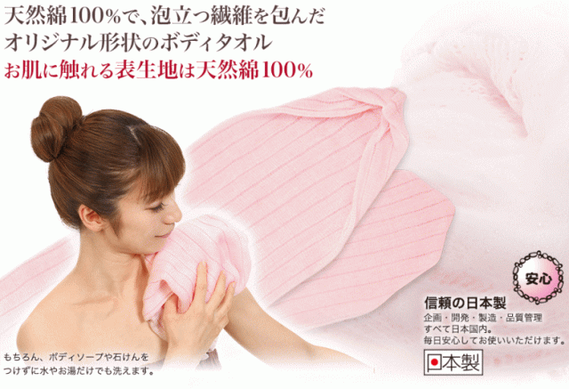 ・お肌に触れる表生地に天然綿100%を使用、中生地は泡立つ繊維で、肌あたりよくやわらかな風合い、たっぷりの泡をつくります