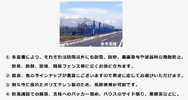 ・各品番により、それぞれは防風以外にも防雪、防砂、農薬散布や塗装時の飛散防止、防鳥、防獣、防球、簡易フェンス等に広くお役に立ちます