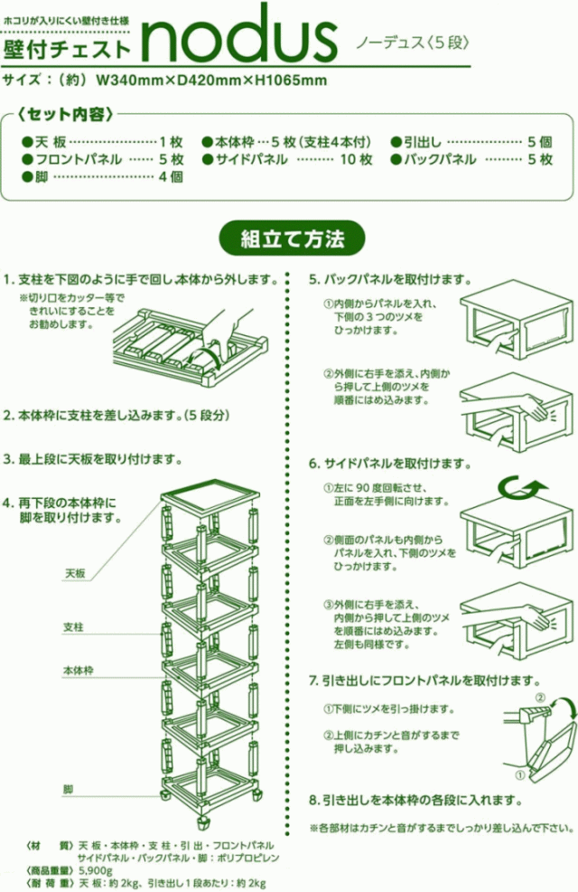 平和工業 壁付チェスト ノーデュス (nodus) 5段 (幅340×奥行420×高さ1065mm)