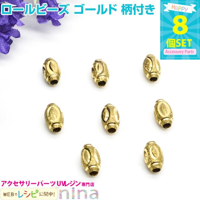 ロールビーズ ゴールド 柄付き 8個セット | ビーズパーツをたくさん活用しよう! / ビーズ ロール ゴールド 金 クラフト レジン液 メタルパーツ アクセサリー ネックレス 柄付き 穴あき ペンダント パーツ アンティーク ペンダント