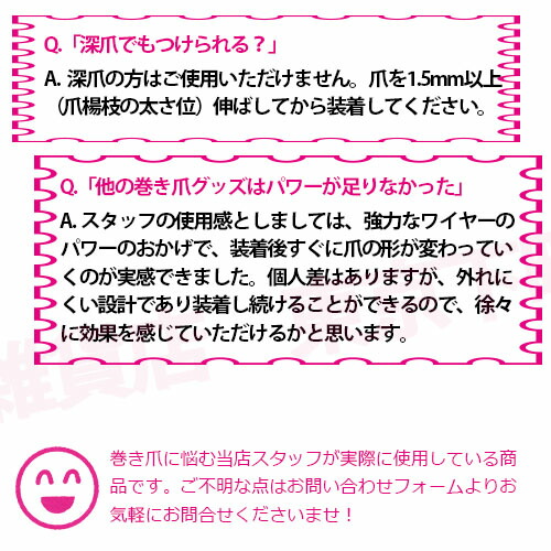 - 装着まで時間がかかりました(爪をかなり伸ばす、厚みのある爪をツメが引っ掛かる程度まで削る)が、装着すると痛み0。1ヶ月近く着け、外しましたが巻き爪に戻る気配もなし。4つのツメのうち端の一個が取れワイヤーが飛び出ましたがテープで押さえて乗りきりました。