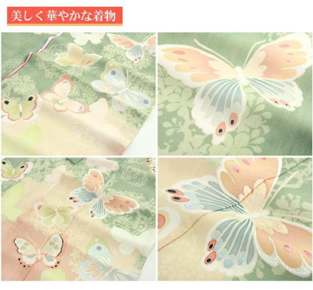 | ※肩上げ加工済み ※身上げはされておりません ※セットの髪飾りは置き撮り画像の物になります。 ※モデル着用の着付け小物類の色、デザインはイメージです。 ※着物の柄の配置は写真とまったく同じではございません。 | |||