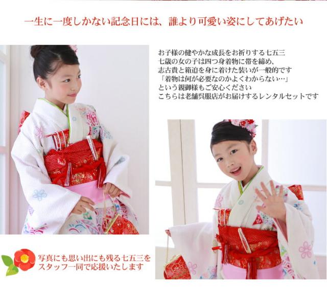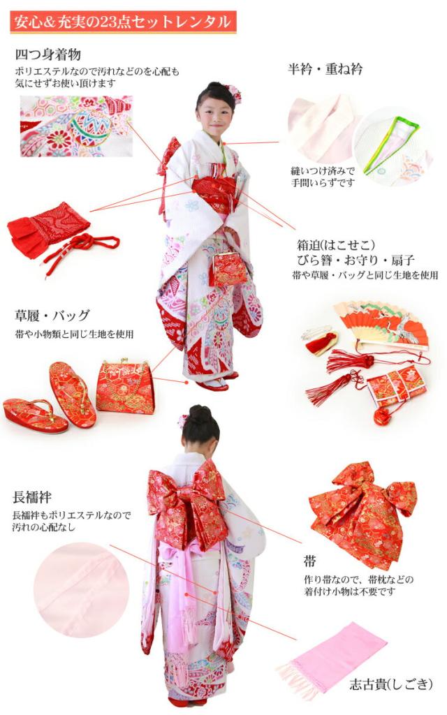 | 四つ身着物・作り帯・長襦袢・半衿・重ね衿・帯揚げ・帯締め・志古貴・草履・バッグ 箱迫・扇子・お守り・びら簪・肌着・裾除け・伊達締め2本・腰紐2本・コーリンベルト2本・足袋 | |||