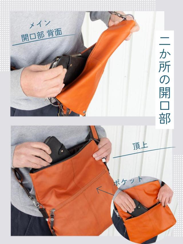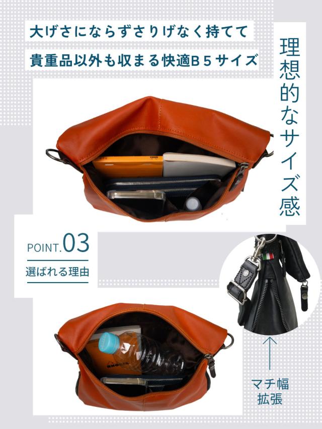 イタリアンソフトレザーの味わいのあるレザーショルダーバッグ。薄マチでスッキリスマート、底マチをファスナーで広げることが出来ます。
