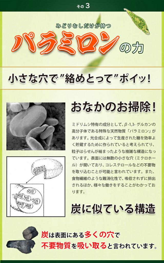 | 原材料名 | ユーグレナグラシリス、イヌリン(食物繊維)、 麦芽糖、結晶セルロース、ショ糖脂肪酸エステル、微粒二酸化ケイ素、ステアリン酸カルシウム、増粘剤(グァーガム) |