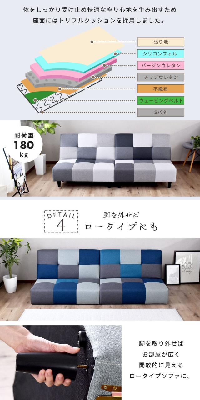 お部屋の雰囲気を一気に華やかにしてくれる存在感抜群のパッチワークデザインソファ。遊び心のあるデザインながら、派手すぎない落ち着いたトーンのカラー配色で幅広いインテリアに馴染みます。お好みやお部屋のテイストに合わせて選べる4色展開でリビングのアクセントやワンルームの主役として、置くだけでセンスある空間を演出します。