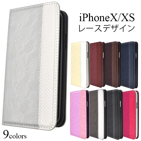 iPhoneX iPhoneXS用 手帳型 レースデザインレザーケース お洒落 フェミニン 保護カバー ベルトなし スマートフォンケース