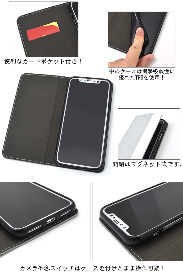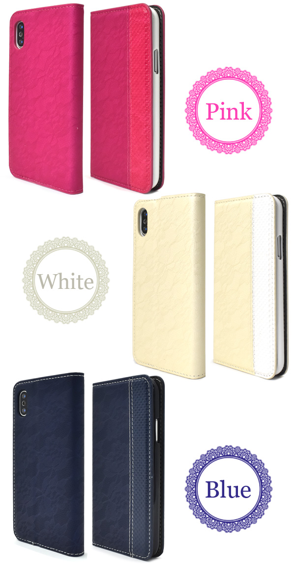 レザー地の上に薄くレース柄がプリントされた上品なケースです。内側はスウェード調になっており手触りも抜群! 便利なカードポケットつきです! 衝撃やキズなどからスマートフォンを守るのはもちろん、カメラ、イヤホンや各種ボタンなどをケースに入れたまま操作することもできます。※iPhoneX/iPhoneXSは付属しません。※ライセンス商品ではありません。※ケースをつけたまま撮影できますが、フラッシュ撮影時にケースの色が移り込むことがあります。