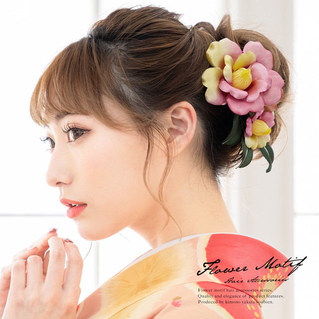 成人式 髪飾り 成人式の髪飾り 2点セット ピンク系 黄色 緑色 椿 花 コサージュ ラメ コーム Uピン 髪留め 卒業式向け 振袖向け 袴向け ヘアアクセサリー 日本製 和装