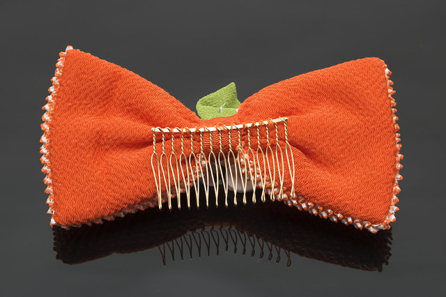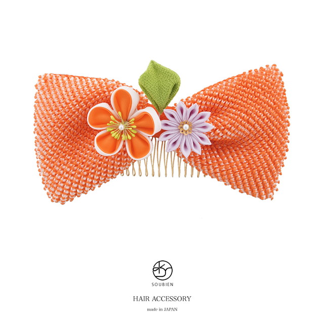 髪飾り リボン 橙色 オレンジ 梅 剣菊 花 りぼん 絞り つまみ細工 コーム 髪留め 成人式向け 卒業式向け 振袖向け 袴向け ヘアアクセサリー 日本製 和装