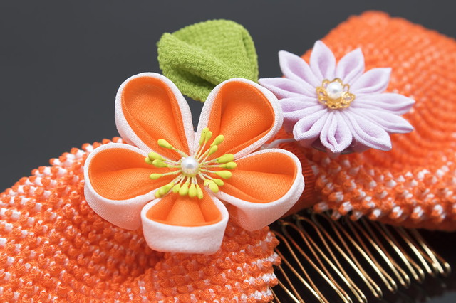 着物のヘアスタイルを彩る、つまみ細工の髪飾りです。