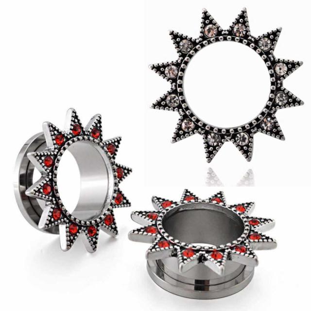 [ 2G 0G 00G ジルコニア ボディピアス ] アジアン フレアクリスタル トンネル ボディーピアス 2ゲージ 0ゲージ 00ゲージ サージカルステンレス316L メンズ レディース 耳 ホールピアス プラグ ネジタイプ 埋め込み レッド 赤色 ラインストーン エスニック ボヘミアン 太陽