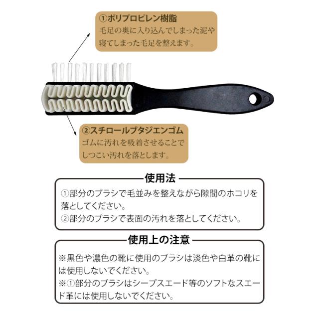 スエード(起毛革)の汚れを効果的に落としながら毛並みを整える起毛革専用ブラシです。