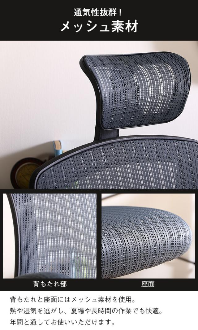 長時間の着席や、夏場でも蒸れにくいメッシュ素材を使用。