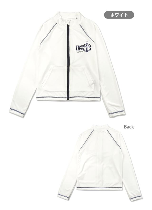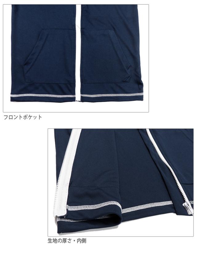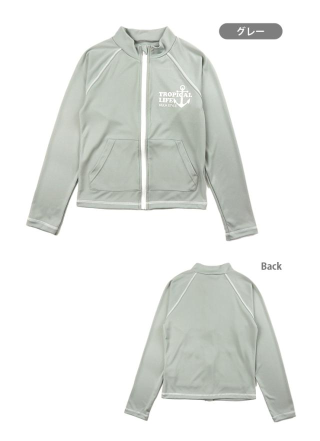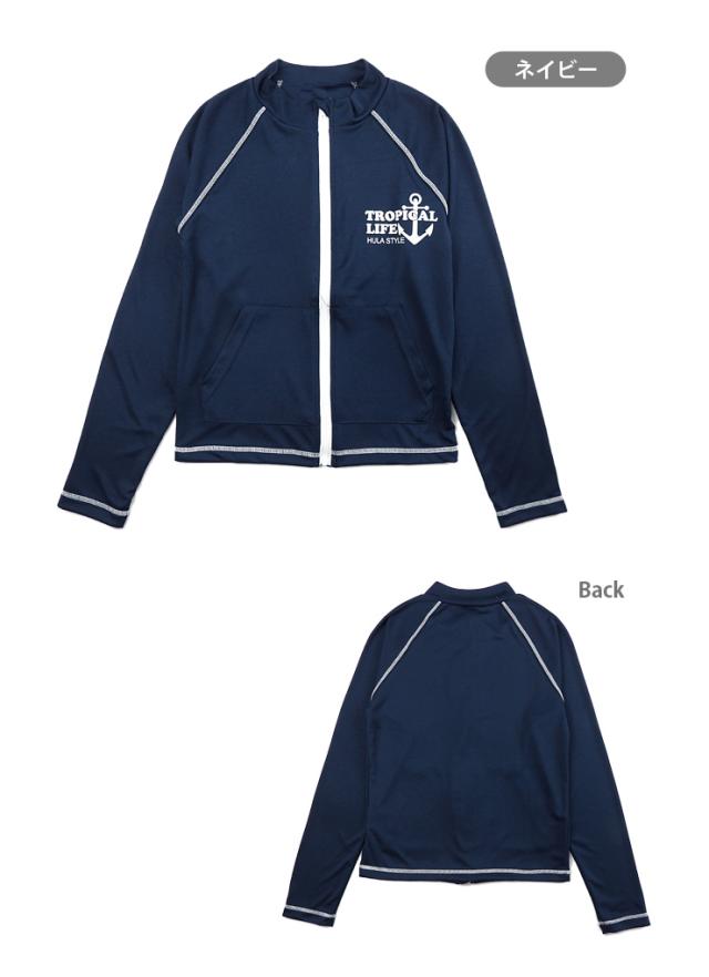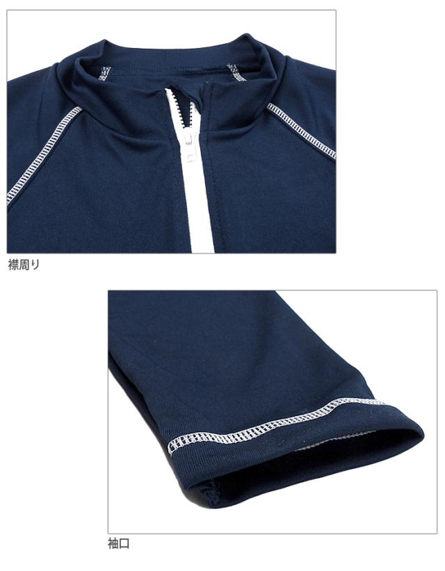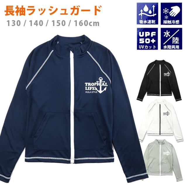 キッズ・ジュニア用長そでラッシュガード水着。 シンプルなデザインの男女兼用です。 水陸両用なので海やプールはもちろん、アウトドアやちょっとしたアウターとしてもご使用できます。 柔らかい手触りの素材感で着用後も動きやすく、ジップアップタイプなので着脱もラクラクです。 UPF50+で紫外線からお肌を守ります。 触るとヒンヤリと感じる接触冷感素材を使用。