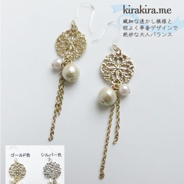 ピアス ゆれる コットンパール 華奢 大人 チェーンアンティーク レース柄 透かし模様 レディースアクセサリー メール便送料無料 選べるカラー ゴールド シルバー 金属アレルギー対応 樹脂ポスト 普段でも、結婚式 お呼ばれ フォーマル パーティに!【売れ筋】