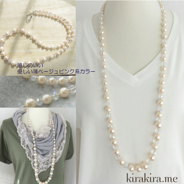 ロング パール ネックレス 華やか 結婚式にも ピンクベージュ レディースアクセサリー きれいめ お呼ばれ ガラス フォーマル