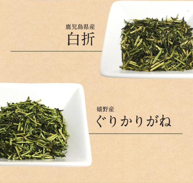 嬉野ぐりかりがね:緑茶(嬉野産) 静岡雁ヶ音:緑茶(静岡県産) 鹿児島白折:緑茶(鹿児島県産) | ||