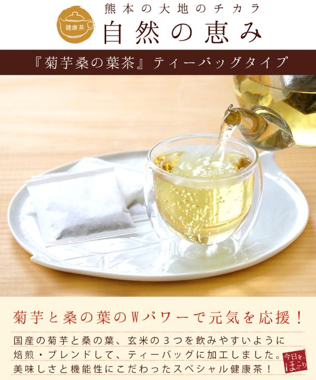 | 商品説明 | 1.各種メディアで話題沸騰中!血糖値の上昇を抑え「飲むインスリン」とも紹介されたスーパーフード「キクイモ」を使用したお茶。食物繊維もたっぷり含まれ健康・美容に嬉しいお茶です! 2.こちらも血糖値上昇を抑えるとして注目の「桑の葉」、香ばしい「玄米」をブレンドすることで、より飲みやすく仕上がりました。 3.原材料はすべてこだわりの国産!またティーバッグタイプでラクラク作れます♪ |