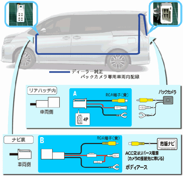 ノア/ヴォクシー/プリウスα/カムリハイブリッド/エスティマ/カローラフィルダー用 トヨタ純正バックカメラ用に準備された車両内配線カーナビに接続配線