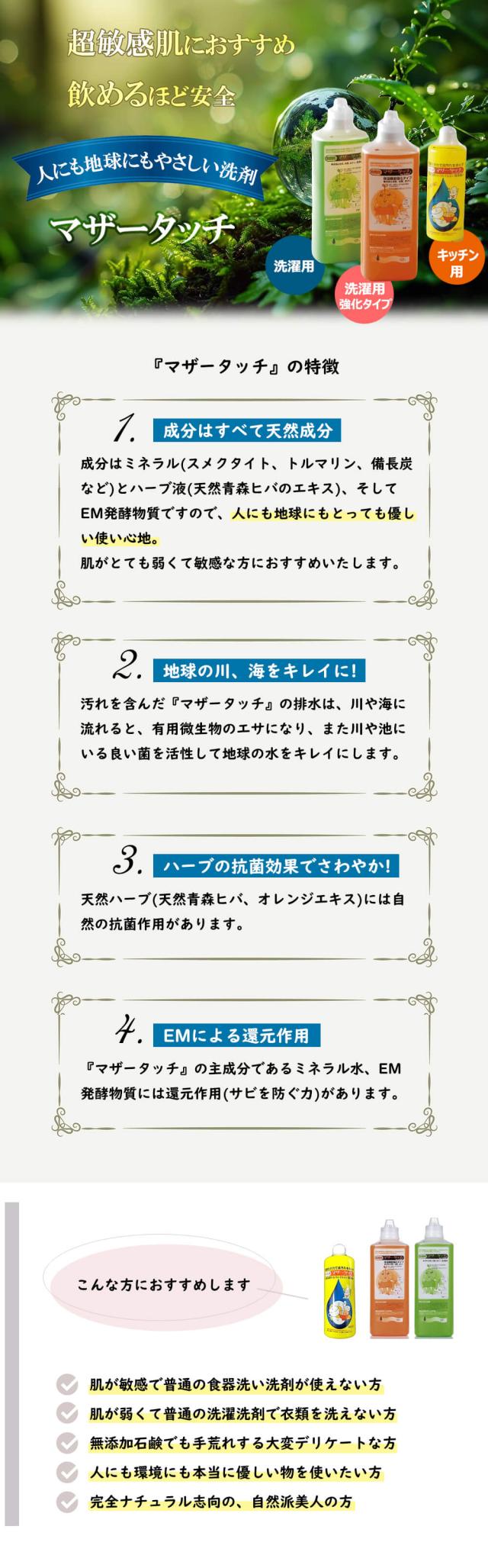 健康飲料水として開発されたマザータッチは、飲んでも安全なほど優しい洗浄液です。