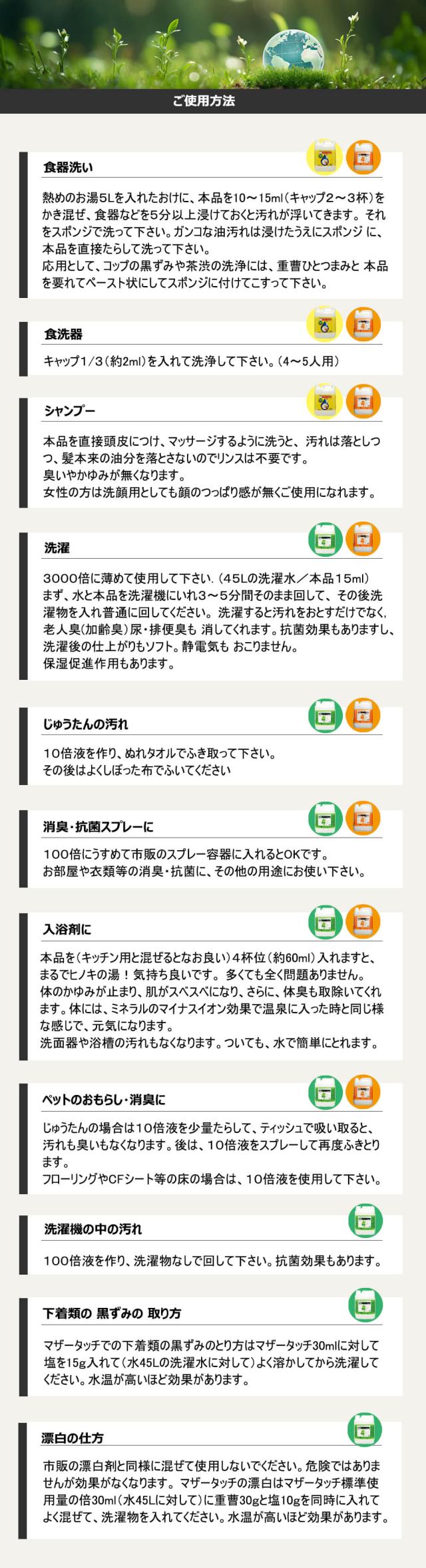 (1)お洗濯・・・3000倍(45Lの洗濯水に15ml)にうすめてご使用ください。『マザータッチ』を入れた水を3〜5分間ぐらい洗濯機を回して、その後洗濯物を入れて回してください。水が活性化して、汚れがよくおちます。すすぎは最低1回してください。