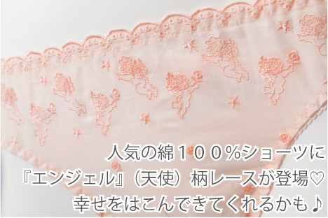 幸せをよぶ!?かわいいエンジェルレースが超キュートな綿100%ショーツです。肌にやさしい綿100%ショーツは、これまで痒みやかぶれなどのお悩みをお持ちの方からだいぶお肌の状態が改善されたというお声をたくさんいただいております。是非肌にやさしい綿100%ショーツ、履いてみてください。(*^-^*)