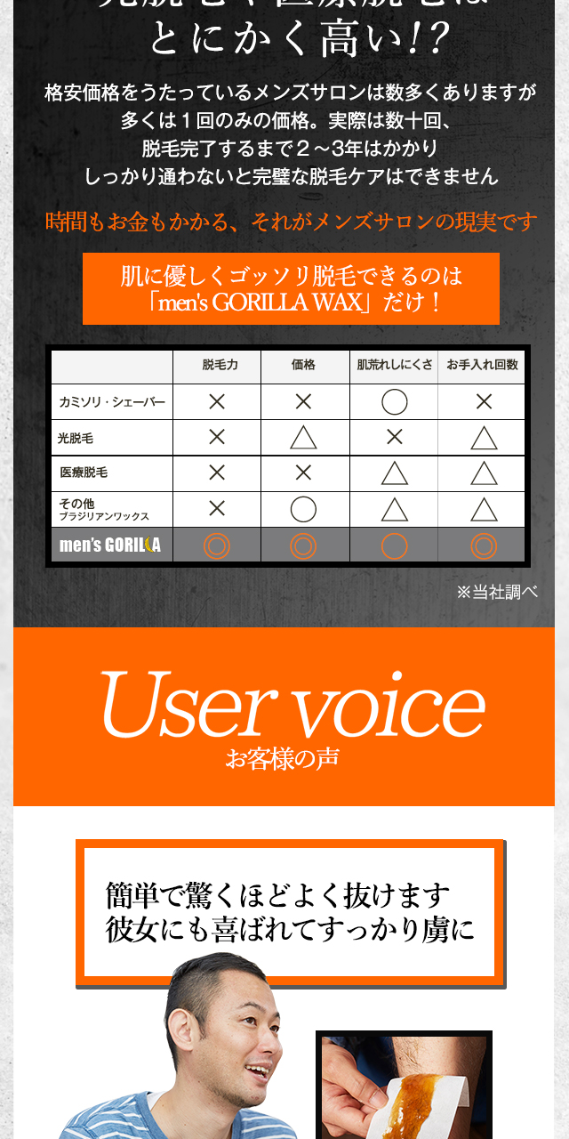 | 特徴 | 日本人男性向けに開発された、脱毛ワックス。 食べられるくらい安全なオーガニック成分で、首から下の全身に使える! |