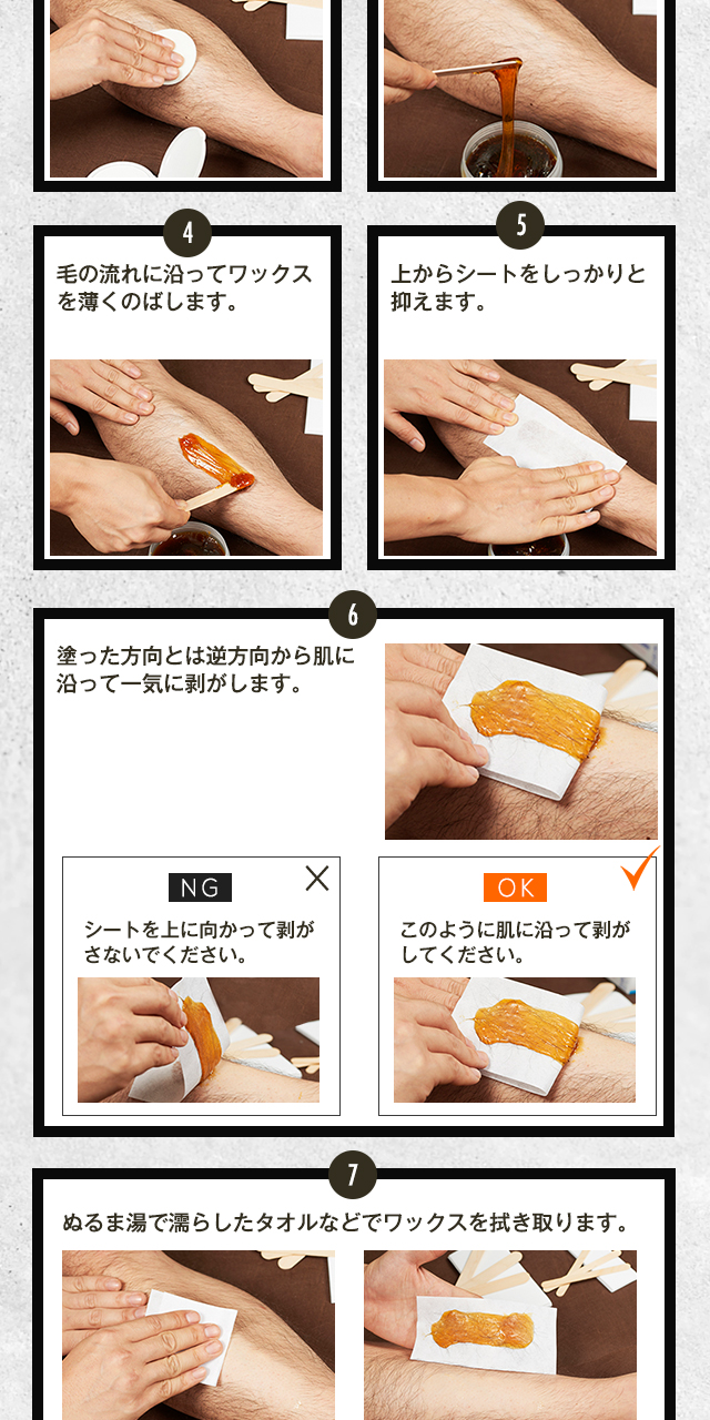 キット内ワックス成分:水、シュガー、ハチミツ