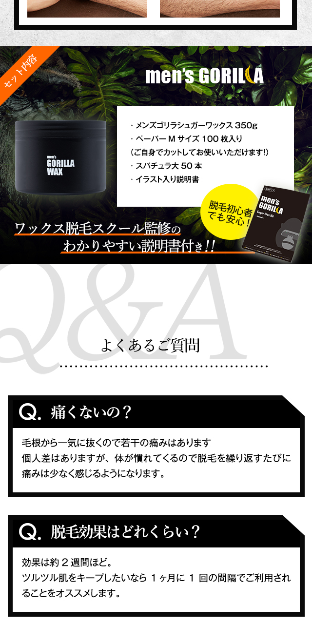 | セット内容 | ・メンズゴリラシュガーワックス 350g ・ペーパーMサイズ 100枚入り ・スパチュラ大 50本 ・イラスト入り説明書 |