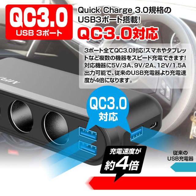 PD20W+QC3.0対応USBポート3口付3連シガーソケット