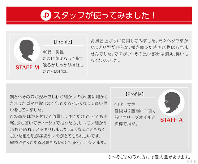 - おへその掃除は全く無頓着で何十年もしてなく、かなり黒くなってました。 実際使ってみて、いきなり全部はキレイにはなりませんが、2回目、3回目と大きい汚れから少しずつ確実に取れていきました。しかも綿棒とかで擦るとかないので傷付く事もなく、自然とキレイになっていく感じです。 受注番号35347757010-418742352